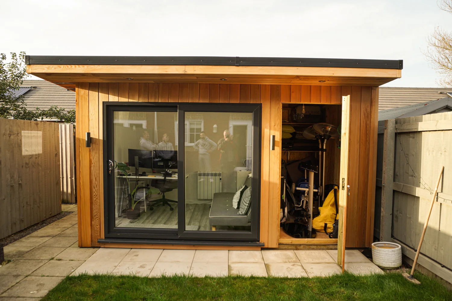 2.4m x 3.6m Timber frame construction with 50mm insulation and rubber roof clad in red cedar. The build is split 1/3 to 2/3rds to create an office space and a hidden storage area. Optimally designed to best suit the space available